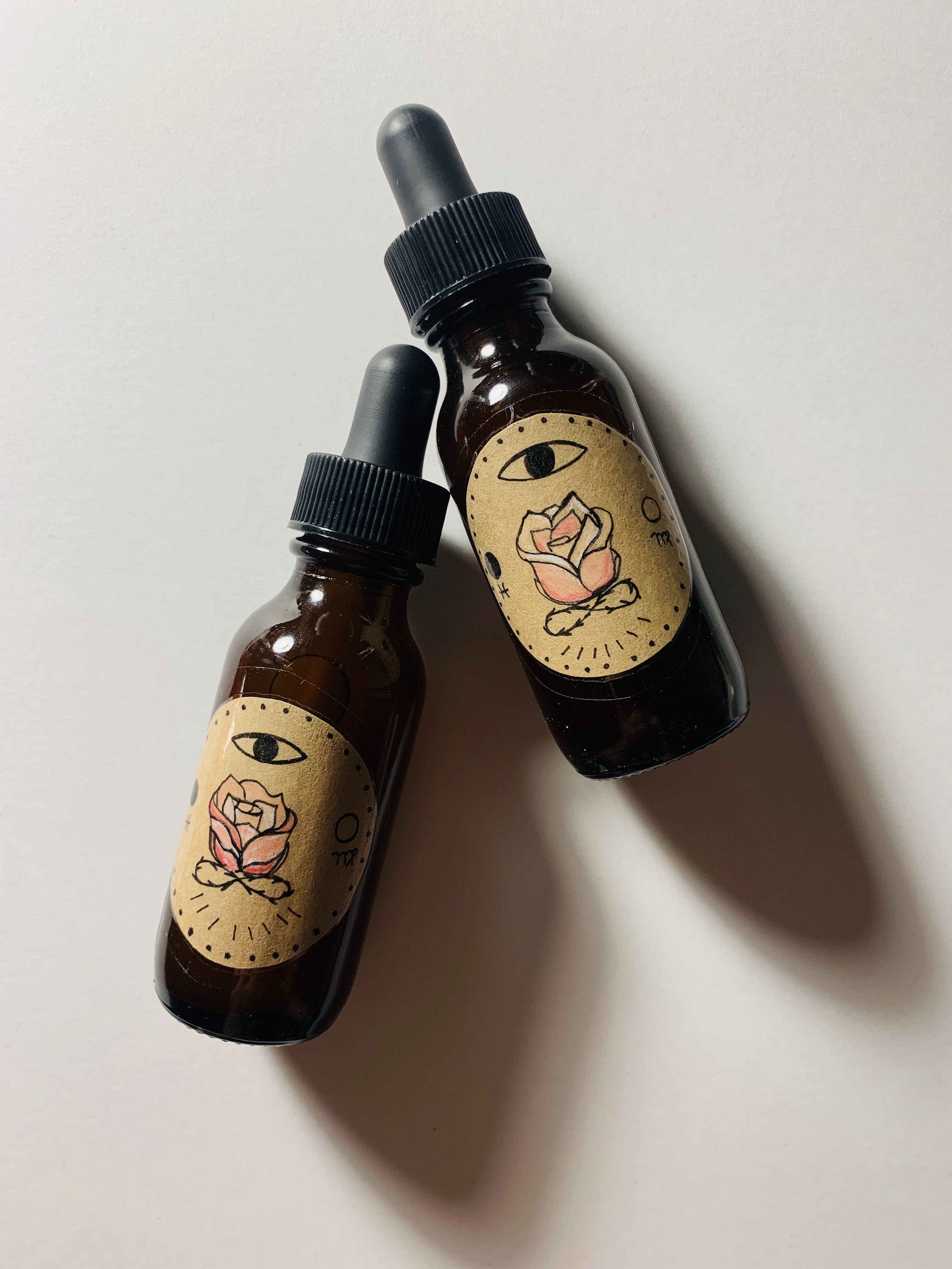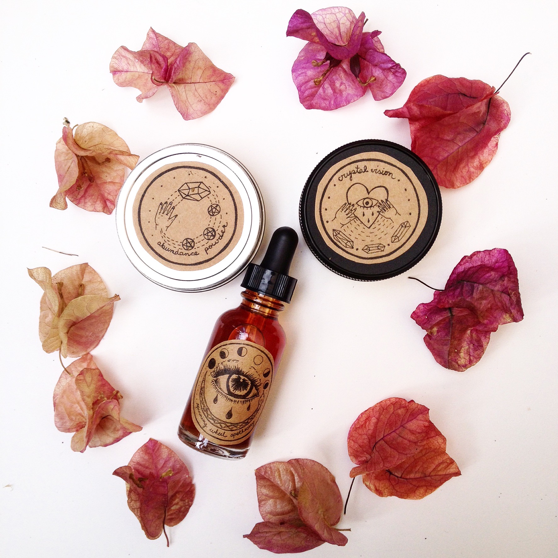 I also love working with: ancestral practices, pendulums, daily beauty rituals, dream work, crystals, food, candle magic, the moon, astrology, flowers and my art practice which is very tied in with my intuitive magic. It is truly endless! I generally practice magic in a solitary way with the exception of a few people. In 2014 a dear friend and I started Spinning wheel apothecary, seasonal magical boxes. A magic CSA share kinda deal. Below are photos of some of our products that we created.