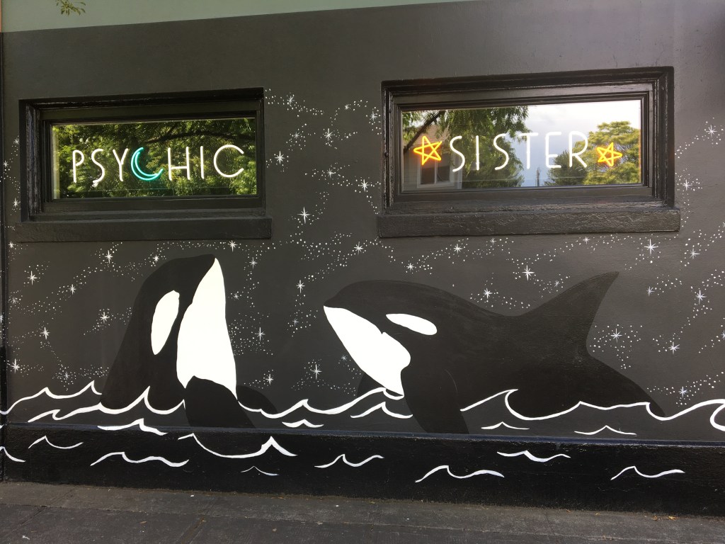 Below is a mural I designed for the Portland, Oregon Psychic Sister store in April 2018. I acknowledge that this mural is on the traditional and ancestral homeland of the Multnomah, Kathlamet, Clackamas, Tumwater, Watlala bands of the Chinook, the Tualatin Kalapuya and the indigenous nations of the Columbia River.