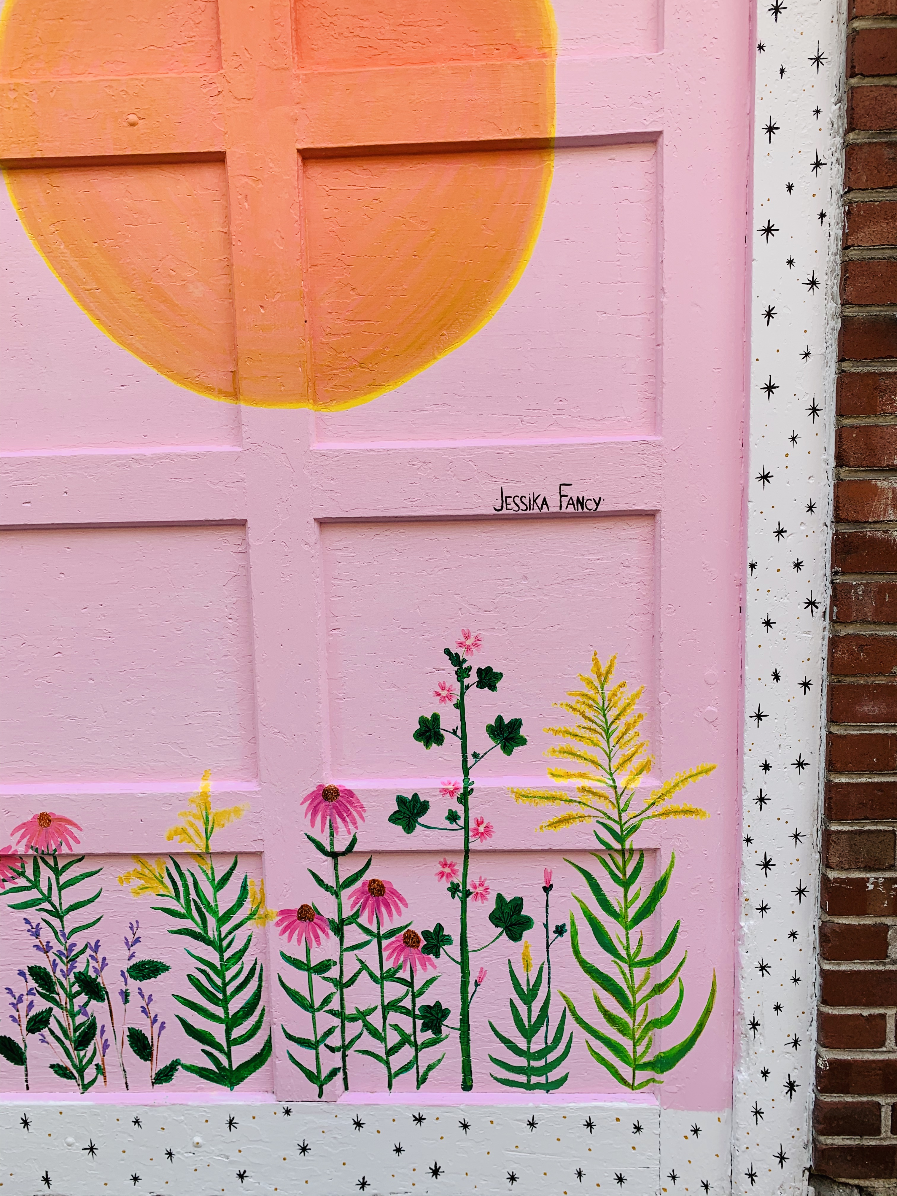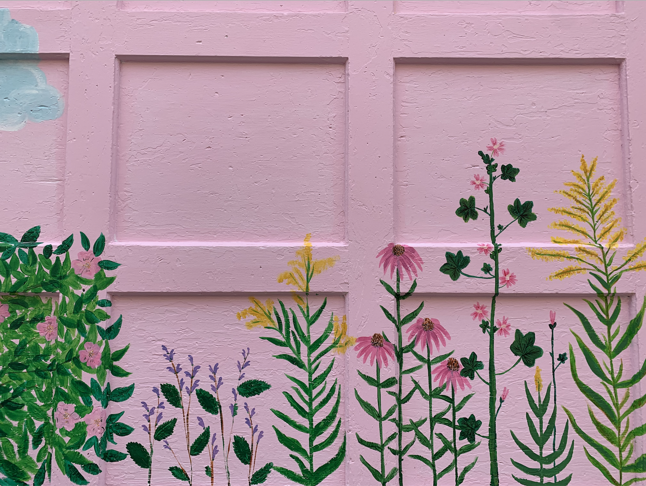 The plants in the mural are as follows: Goldenrod~ Solidago Canadensis, High Mallow~Malva Sylvestris, Wild Rose~ Rosa Acicularis, Skullcap~ Scutellaria Lateriflora, Echinacea~Echinacea purpurea.